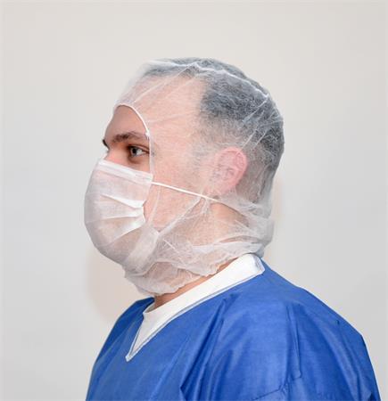 Egy fejet beborító kámzsa és gumis, légáteresztő szájmaszk kombinációja – ideális sterilebb, higiéniai, élelmiszeripari vagy laboratóriumi környezethez.